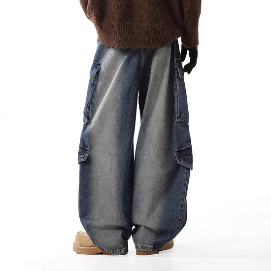 Vintage Washed Jeans for men, featuring a unique deconstructed design with multi-pockets. These high street style jeans offer a loose fit, midweight comfort, and light wash perfect for daily wear in all seasons.