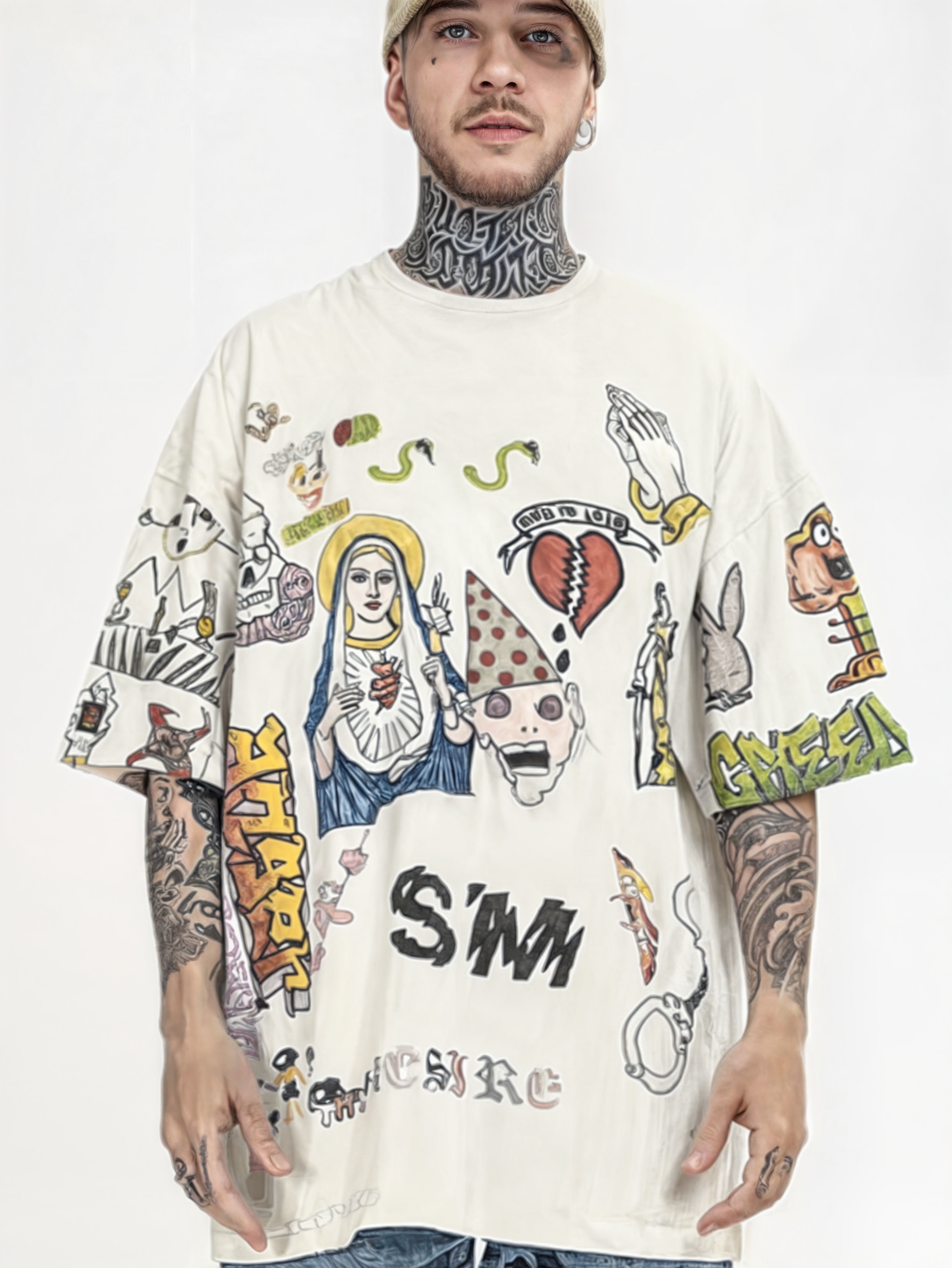 From the slick knit weaving to its graffiti pattern, this piece isn’t just another T-shirt. It’s your canvas, and every time you throw it on, you're telling the world you’re ready to break norms and create your own style rules. Made for those who dare to stand out and push the limits, whether you’re hitting the mall or chillaxin' with your crew, this tee is the choice. It’s not about fitting in, it’s about owning your look with a blend of rebellious goth and street smart charm. Get set to vibe, get set to stun.