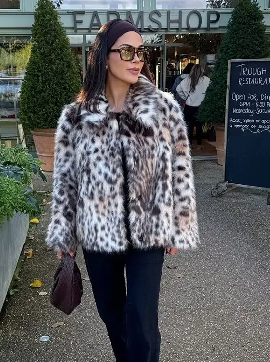 chic women’s cropped fur jacket in a striking leopard pattern. This high street-style, windproof faux fur coat is perfect for keeping warm during autumn and winter.