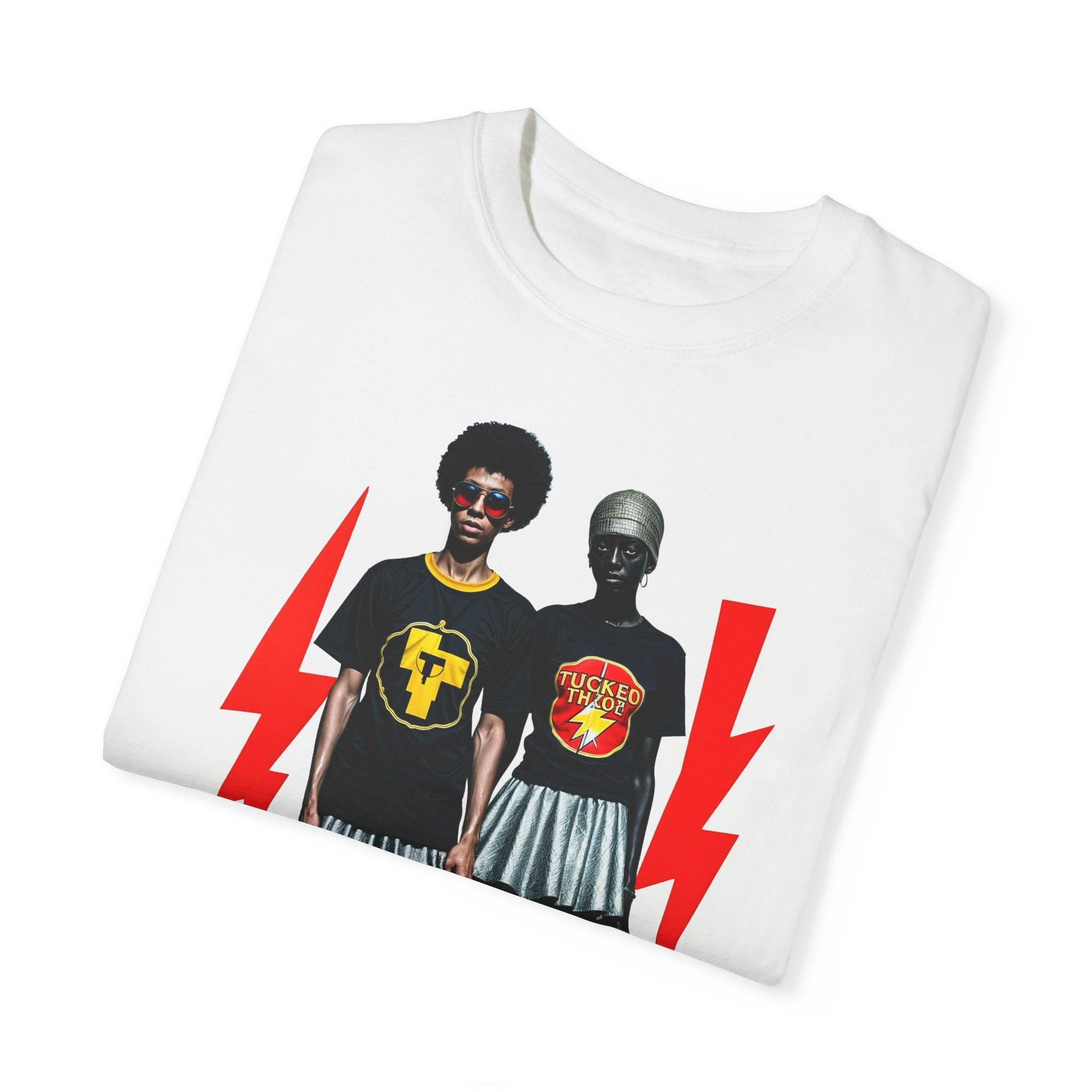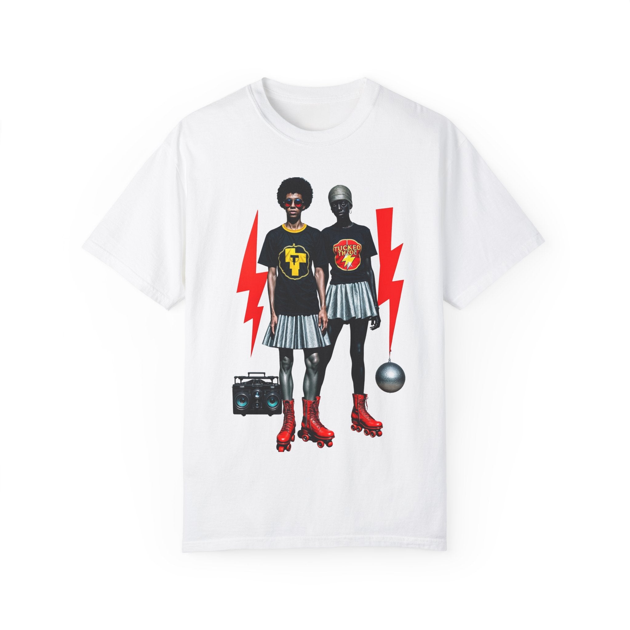 Turn heads and ignite conversations with the "Retro Roller Rebels" graphic t-shirt, a bold celebration of individuality and style. Featuring a dynamic duo rocking roller skates, striking lightning bolts, and eye-catching retro elements, this design blends vintage vibes with modern edge for the ultimate statement piece.