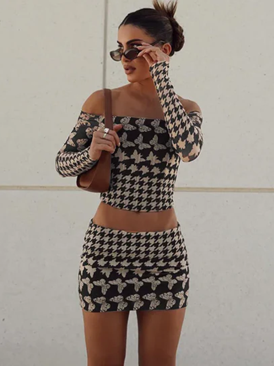 Discover the Long Sleeved Printed Set featuring a sexy one-line neck T-shirt and a high waisted, buttocks-wrapped skirt. This slim fit, stylish set made from man-made fiber is designed for women who love unique print patterns.