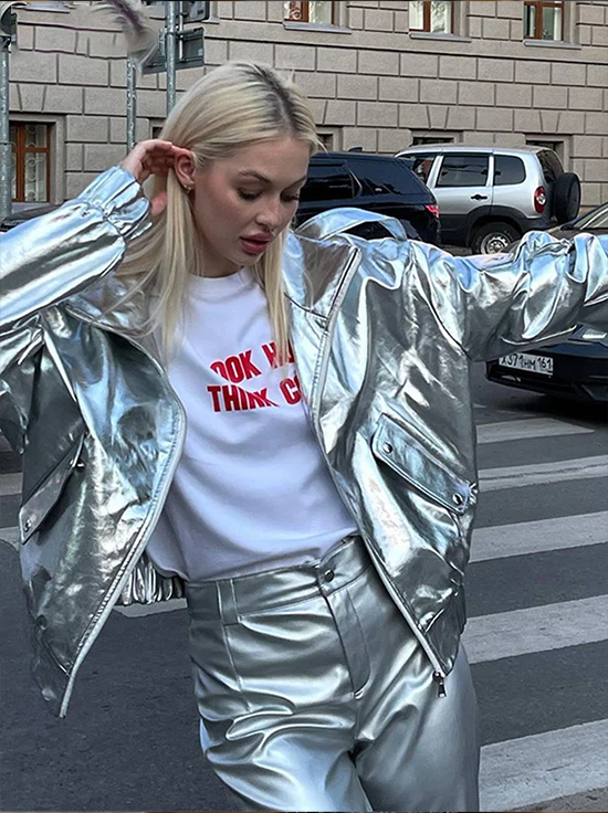 Discover the stylish Fashion Silver Jacket for women, featuring a turn down collar, zippers, and pockets. Perfect for the 2025 autumn/winter season, this high street Y2k outwear offers casual elegance with a polyester build