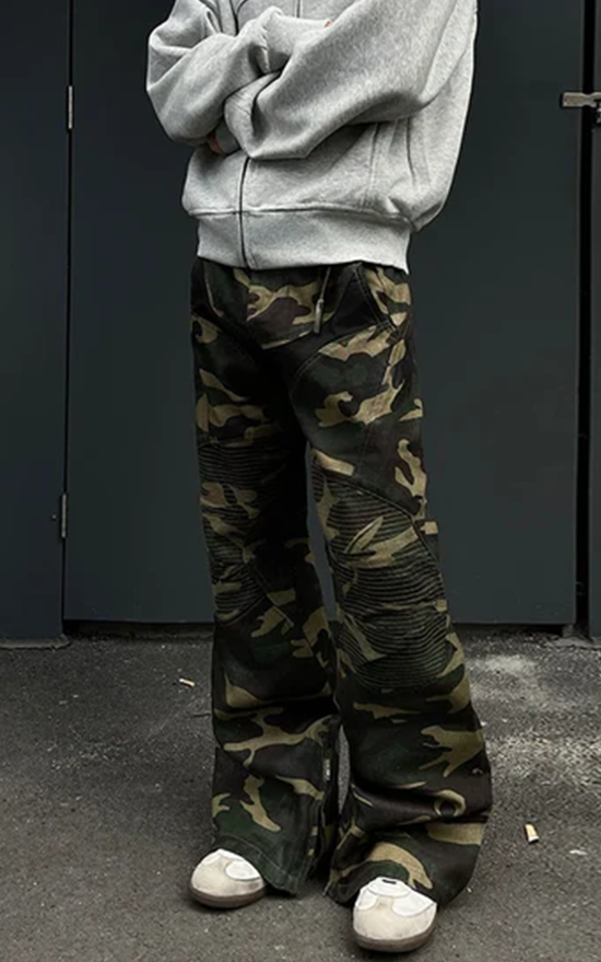 Brush Wax Coated Motorcycle Shaped Men's Jeans. Camouflage, vintage style with midweight denim. Perfect for every season with a comfortable loose fit and stylish flare.