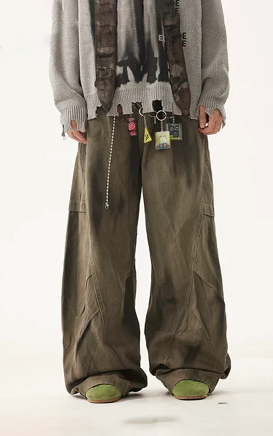 Vintage washed trousers with deconstructive pleats and machete style. Perfect for all seasons, these loose wide-leg casual jeans offer a comfortable fit with light wash denim and practical pockets. Shop now for versatile mid-weight denim crafted with soft fabric.